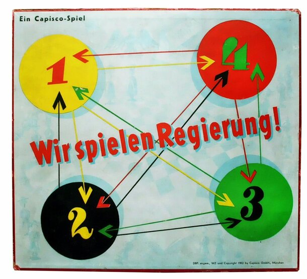 Title means in English: "We play government!", game was released in 1952. It was far ahead of its time and with an outstanding equipment. It was a two-part-game played on both sides of the gameboard: The first part was a roll-and-move game, but it had many twists to change the later part of the game. This second part was played on the backside of the...