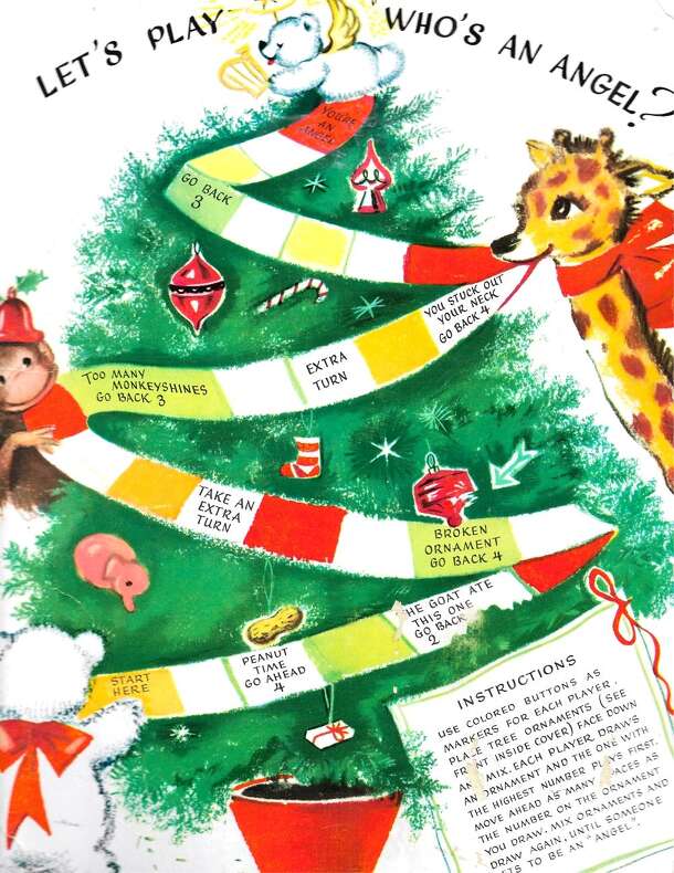 Start at the bear and look way up there... there's an Angel at the top of the Christmas tree! Grab a button to use as a token, then draw an ornament from the shuffled pile and move ahead along the board track... but watch out for the spaces with setbacks (goats eat your peanuts, ornaments break, monkeyshines and giraffe necks). If you've been nice this...