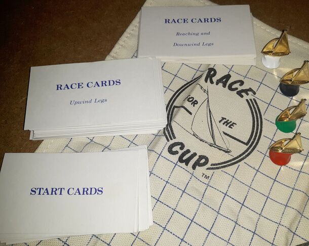 A game of chance and skill based on the America's Cup theme. For two to four players. The object of the game is to be the first player to complete the eight leg race. "Race for the Cup" will challenge the yacht racing enthusiast, educate the sailing novice, and prove entertaining for fan of the sport of sailing. The board is a cloth with squares marked on...