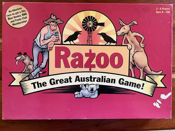 An hilarious race to get a Ute, Blue Heeler, BBq, and Footy Club Membership! Includes playing board and die, playing tokens, "Tassie Devil" "Raw Prawn" and Square Deal" cards other cards and play money. Whether you're winning a chook raffle or the Melbourne Cup; buying a ute or a blue heeler; Joining a footy club or wrestling with a crocodile; or even...