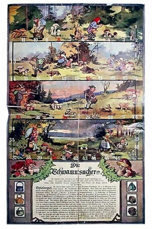 Up to six people can participate in this game, each paying 12 tokens into the till. You roll a die and move your piece according to the number of eyes thrown. Pay attention to the mushrooms shown. Those marked with + are poisonous; if you come up with such a (red) number, you pay 2 tokens into the register and pass one roll of the dice. The other mushrooms...