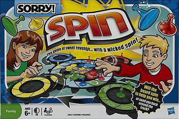 The twists and turns never end in this fun game! Just like in the classic SORRY game, your goal is to get your pawns back to their same-colored home. But watch out: in the SORRY SPIN game, if you draw a Spin Card, the playing board turns and you could end up getting closer to your goal or whizzing right past it! In a SORRY SPIN showdown, revenge is sweet...