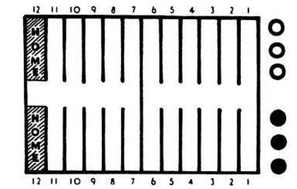 A seventeenth century French game played on a Backgammon board. Each player only uses three pieces. The pieces race in the same direction along opposite edges of the board rather than circling the entire board as in Backgammon. The pieces start off board. Entry and movement are determined by the roll of two dice. The number on each die may be used...