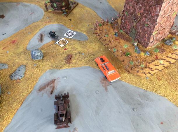 The race take place on a 6´x4´ flat surface where you place terrain and 5 point markers. You have to race thru the markers in order two times to win (two laps). At dispenser points you can get weapon, traps, shields a.s.o to use during the race. Each turn you can do one of three things: Move: Move +D6”, pivot once by up to 90°, can use one item Drift: Move...