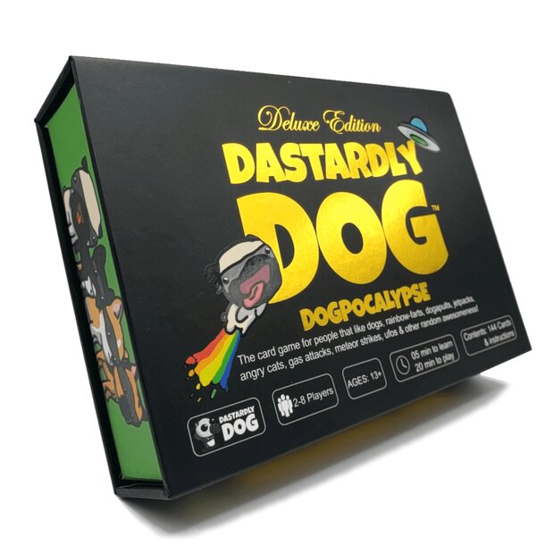 Dastardly Dog's Dogpocalypse is a 2-8 player card game for families and parties, it takes 5 minutes to learn and 20 minutes to play. Race to the Winners Bone with Rainbow-Farts, Dogapults, Go-karts, jet packs, and more or you can attack the other dogs with UFOs, Zombies, Mini-Nukes, Lightning Strikes, dog catchers, and more but don't forget to yell woof or...