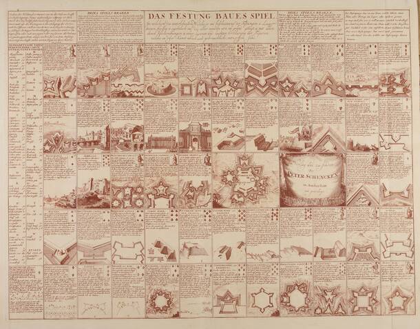 Das Festung Baues Spiel, an early 18th century military fortifications board game, comprises 52 engraved playing cards numbered sequentially. The cards use the French suits — with the suit being an image of a fortification, many rather intricate and some quite attractive — along with a paragraph of explanatory text. Along the top of the sheet additional...