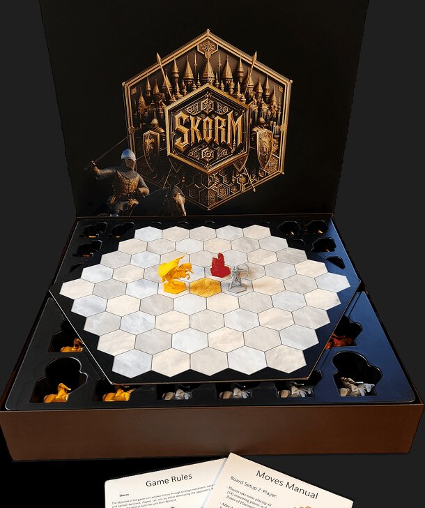 Skorm is a medieval combat strategy board game that models ancient military tactics on a hexagonal grid. Designed to simulate historical combat formations, the game utilizes pieces representing specific battlefield units: Shieldmen, Archers, Horsemen, and a Warlord. Players command these armies across a board composed of sixty-one hexagonal tiles, aiming...