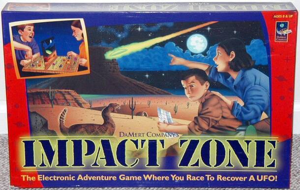 Battleship clone where players try to be the first to find the seven UFO pieces their opponent has hidden on their side of the board. Players take turns calling out zone numbers. If the space is empty, nothing happens. If a UFO piece is hidden there, they take it. If it has a rattlesnake, mine, or coyote, they lose a turn. Game has sound effects for when a...