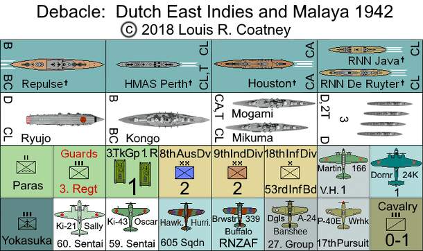 Abstracted land, sea, and air game. 9-day turns, so a normal 8Dec41-6Mar42game is 10 turns, although the game can be shortened by an even earlier Japanese victory or lengthened by a stubborn, crafty Allied/ABDA defense. Individual battleships and carriers, otherwise usually 2-cruiser, 4-destroyer and 6-transport divisions, air squadrons, and regiment or...