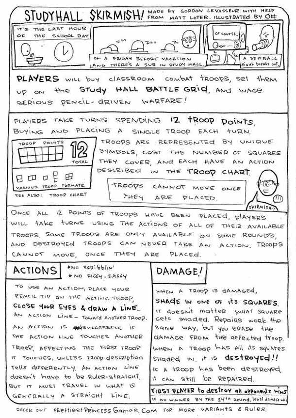 It’s the last hour of the school day, on a Friday, before a vacation, and there’s a substitute teacher in study hall. Of course a spitball fight breaks out … Players will buy classroom combat troops, set them up on the study hall battle grid, and wage furious pencil driven warfare! Players take turns spending 12 troop points, buying and placing a single...