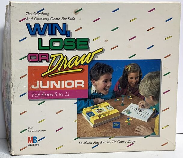 From back of box: "This simpler Junior version of Win, Lose or Draw is designed for children ages 8 to 11! To play, kids pick a card, select a word and call out its category -- People, Places or Things! The sketching starts! The guessing begins! It's a race against time. Correct guesses reward both the Sketcher and the Guesser with chips. Collect enough...