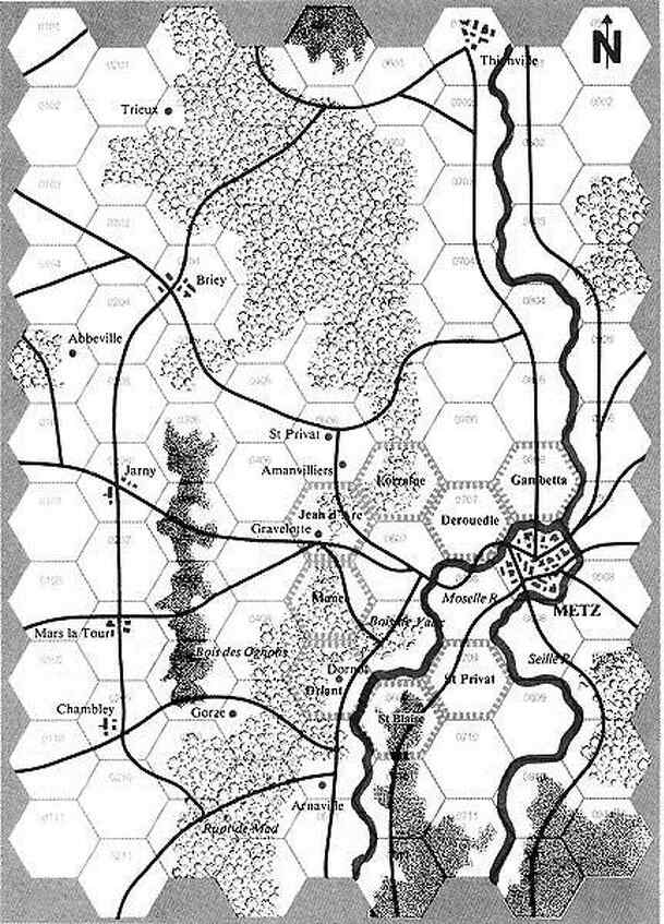 This is a small wargame published in Mr. Dunnigan's The Complete Wargames Handbook, starting with the first edition in 1980. Twelve pages of rules, one page of tables, one 5.5" x 8" map, 20 counters. Scale is 4 km per hex, one day per turn, and regiment-sized units. The rules are at http://www.hyw.com/Books/WargamesHandbook/4-3-metz.htm as part of The...