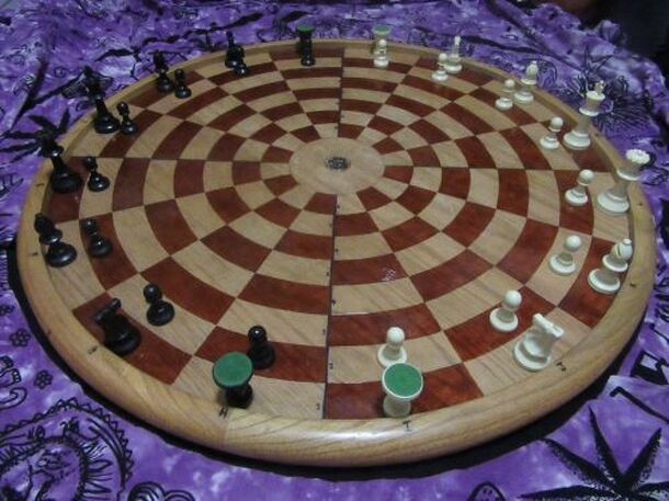 A Circular Chess variant adopted from 10th C. Byzantine Chess. Which adheres to the rules of classical chess with some necessary rule modifications due its circular nature, proximity of pieces, centre of the board, etc. as well as introducing some new concepts. The board has 2 hemispheres subdivided into 16 segments, 8 zones and 128 divisions (like...