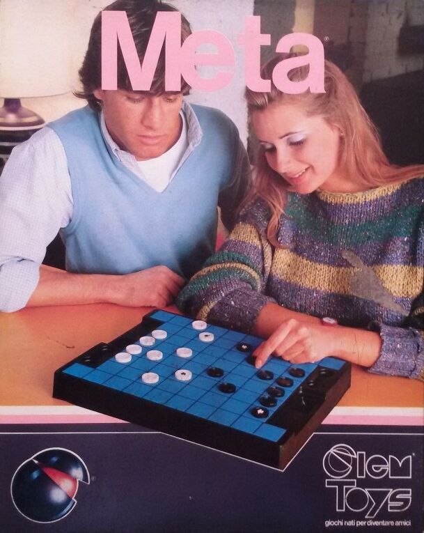 Meta is an abstract game and in Italian it means goal. The term is also used in rugby to indicate the objective of a team: to make a meta. As in rugby, a player's goal is to bring a piece to a meta square on the opposite side. The board is a grid of 64 squares, plus 4 meta squares in the 4 corners. Each player has 8 pieces and 2 arrow-pieces. These 2, like head-prop in rugby, are powerful, but only pieces can make a meta!