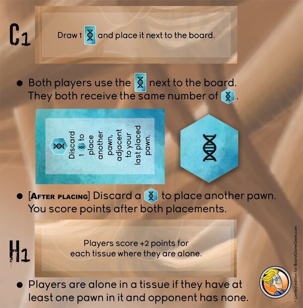 This punchboard adds two new rules to the base game. A1: Special pawns. At the beginning of the game each player takes his special pawn. Special pawns count as two pawns for the purpose of the end game scoring. G1: At game end, each player looses 0/1/3/6/10 points for 1/2/3/4/5 gene tokens he has taken during the game, regardles if they have been used or...