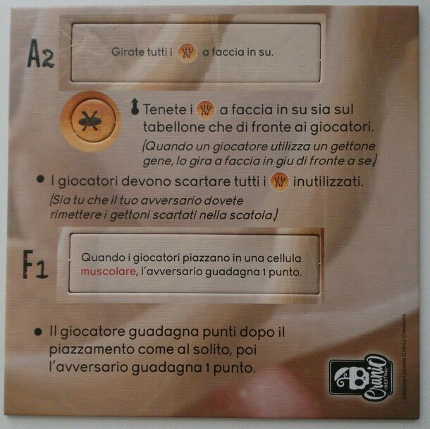This is a punchboard with two new rules and a new gene token you can add to the base game. A2: At the start of the game, reveal face-up all the gene tokens. When a player uses a gene token, put it face-down. New Gene Token: Both players must discard all their unused gene tokens. F1: During the game, each time you place your pawn in a muscular cell, your...