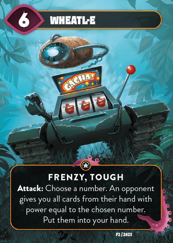 A promo card for all Mindbug sets, distributed at SPIEL Essen fair in 2025. Name: Wheatl-E Power: 6 Keywords: Frenzy, Tough Text: Attack: Choose a number. An opponent gives you...