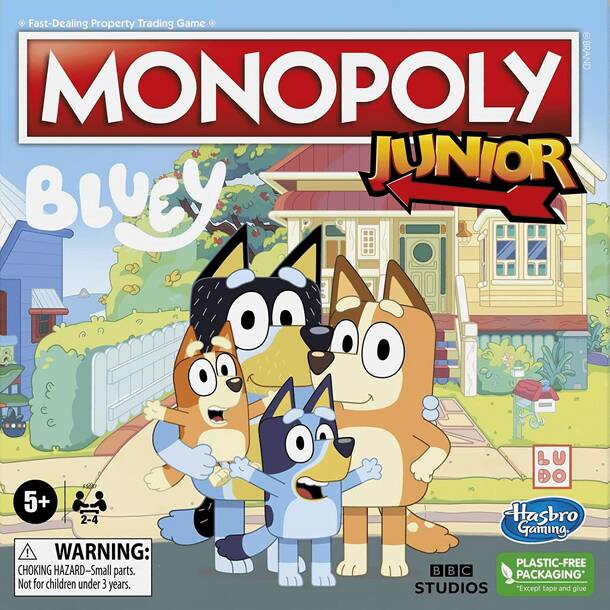 The classic junior version of Monopoly but featuring Bluey and her family. Play all over town with Bluey and her family! Collect dollarbucks and win! Includes Mum, Dad, Bingo, and Bluey tokens!