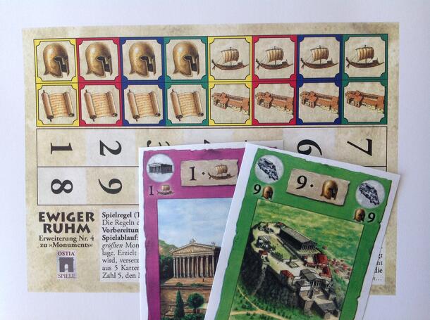 Monuments: Ewiger Ruhm ("Eternal Glory"), a promotional item given away at Spiel 2012, consists of a short scoretrack counting from 1-14, and four tokens in each color, with a set of tokens showing a helment, a ship, a scroll, and a monument. Whenever a player builds or expands a monument, he uses these tokens to track the highest levels of his holdings in these four categories. If, for example, his first monument is of five cards with three ships and two helments, he'd place the monument token on five, the ship token on three, and the helmet token on two. The scoretrack always reflects the highest value you have reached ever in a game, so your token does not go down when your monuments degenerate.