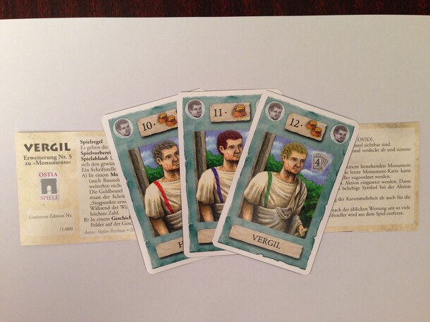 Vergil: Writers of Antiquity consists of three additional cards for the board game Monuments: Wonders of Antiquity. Now when Vergil, Homer or Ovid mention your monuments in their epics, you'll become more and more famous. By paying a certain amount of monument cards, you can attract a writer's attention, making one of your monuments more famous than the...