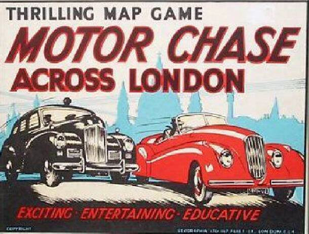 This is a roll and move game featuring a car chase through the London streets. A lead car and 4 pursuit cars are represented by small, cast metal, car model playing pieces. Game has a similarity to Scotland Yard but with much more simple rules. An earlier version of this game is called "Bandit Chase across London" and listed elsewhere on BGG.