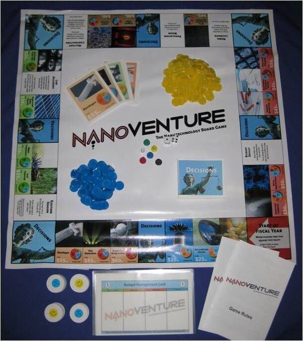 NanoVenture: The Nanotechnology Board Game explores the connections between science, specifically nanotechnology, and society. In this game, players become leaders of a new country. The leaders are challenged to make decisions regarding their country's use of nanomaterials and nanotechnology for industrial expansion, military applications, economic security and basic scientific research, while maintaining a high approval rating from the citizens of the country.These decisions require players to carefully analyze the interplay of technological advances, regulations, public perception and risk, while also learning about the emerging field of nanotechnology.