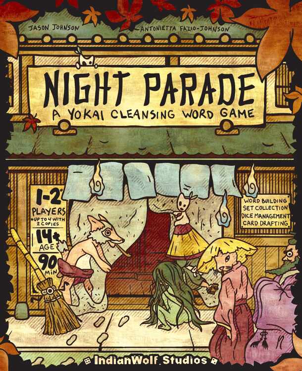 A Night Parade: A Yokai Cleansing Word Game egy remek társasjáték, 1 - 2 játékos részére, az átlagos játékidő hosszú, akár 1.5 - 3 óra is lehet. A társast, 14 éves kortól ajánljuk kipróbálni. A játékmenet erősen épít a kollekció gyűjtés, a kockadobás, a solitaire, a pakli tervezés és a kártya húzás mechanizmusokra.