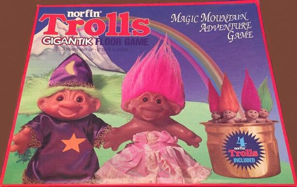 Game is played on a large plastic floor mat. Comes with large plastic dice and four small troll dolls for playing pieces. Game board and play is similar to Candyland with bridges that can be used for shortcuts. Winner is the first to reach the castle.