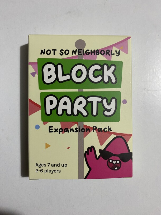 Block Party is an expansion pack for Not So Neighborly. With this pack, your goal is to be the first to complete building a neighborhood by collecting a total of 14 build points....