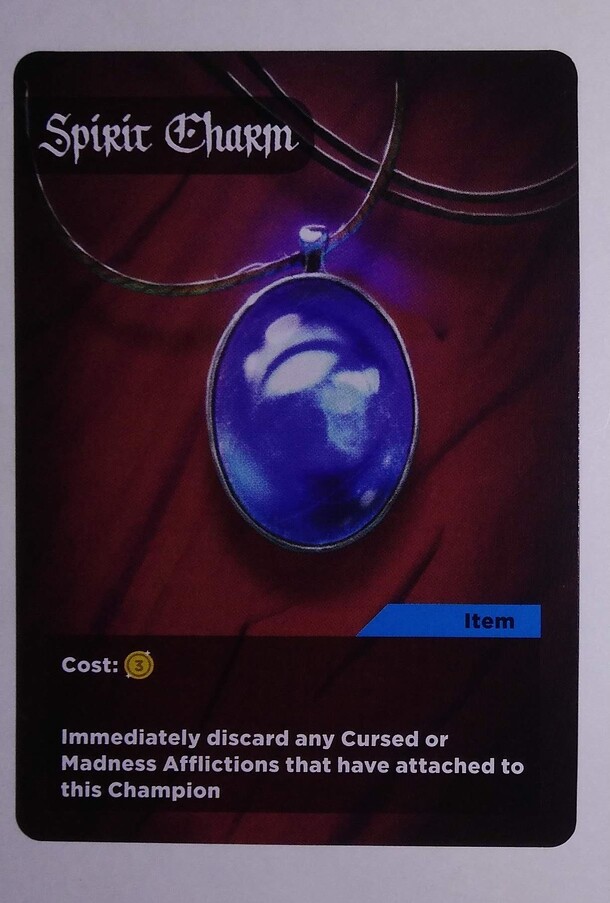 This is a promo card for Of Dreams & Shadows. "Spirit Charm" is a new resource card that you add to the resource deck at the beginning of the game. It is an "Item," with a cost of 3, and the following ability: "Immediately discard any Cursed or Madness Afflictions that have attached to this Champion." It was released in Game Trade Magazine #224 (October...