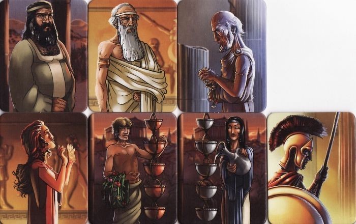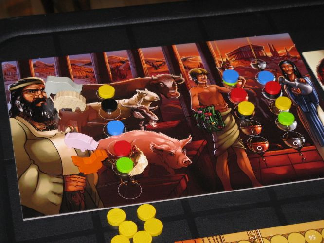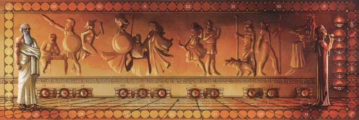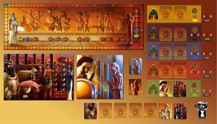 Last but not least : the ritual sacrifice. This is your time to gain the favor of the Gods and Goddesses of Olympus. During the ritual sacrifice, you honor the Olympus Gods by offering them the most sumptuous sacrifice and gain devotion points from them. But beware, towards the end of the game, as the number of altars available in the temple becomes less… players will need to out-wit their opponents to gain the favors of the Gods by offering the most sumptuous ritual sacrifice they can possibly offer before all of the altar runs out. And only one will gain the favor of the Gods.