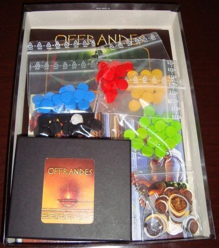 Az Offerings egy közepesen összetett társasjáték, 3 - 5 játékos részére, az átlagos játékidő rövidebb, csak 1 óra. A társast, a bonyolultsága miatt, csak 10 éves kortól ajánljuk kipróbálni. A játékmenet erősen épít az aukció/licit mechanizmusra.