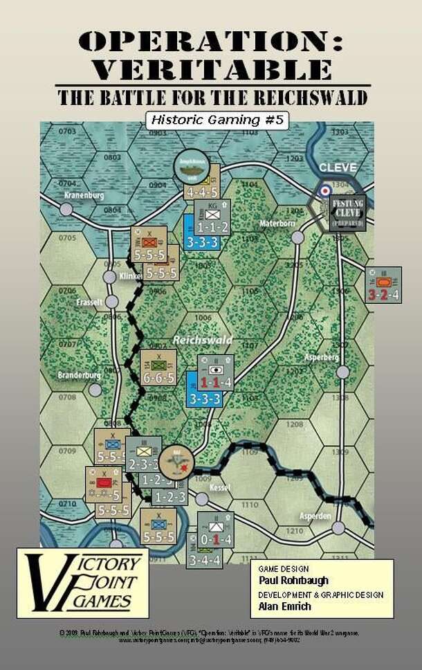 Operation: Veritable is a modest complexity level, two-player game on the battle for the Reichswald (National Forest) during the waning days of World War 2. This desperate campaign was fought during the second and third weeks of February and into March, 1945 in bitter cold and over inhospitable ground. Despite facing looming defeat, the Wehrmacht put up a stiff, well-organized defense -- a matter of history that is told in game format as only the venerable wargame designer and history teacher Paul Rohrbaugh can tell it.