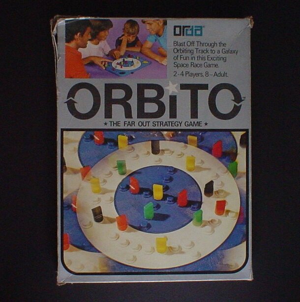 Published 1977 by Israel's Orda Industries, Orbito features an interesting board with a rotating ring, a bunch of stumps to hold the spaceship pegs, and 4 colored 'space station' areas in each of the 4 corners. Additional components are plastic 'spaceships', 4 each of 4 colors, and a 6-sided die.