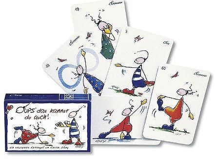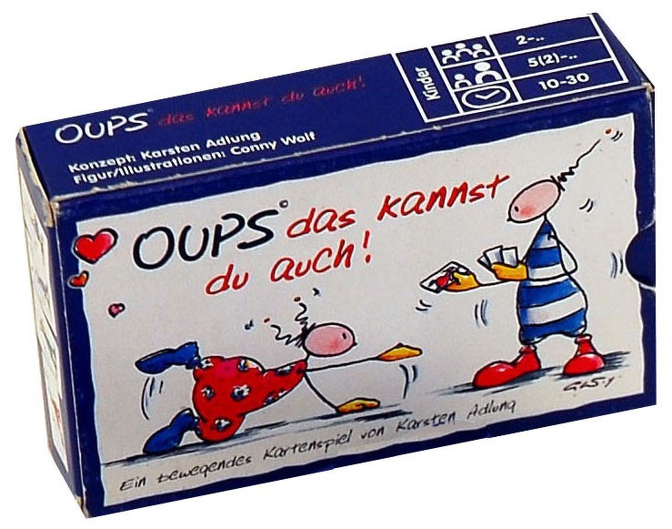 Az Oups das kannst du auch egy nagyon könnyen tanulható társasjáték, 2 - 8 játékos részére, az átlagos játékidő rövid, csak 10 perc. A társas elsősorban gyerekeknek készült, akár már 5 éves kortól is játszható. A játékmenet erősen épít a kollekció gyűjtés, a kártya húzás és a memória mechanizmusokra. Upsz, Te is meg tudod csinálni? – Oups das kannst du...