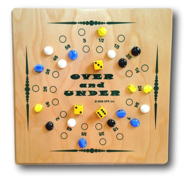 Over and Under is a child's "First Game of Fractions". From Publisher Page: Players place one die over or under another die to create a proper or improper fraction in this...
