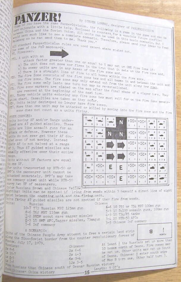 Panzer! is a near-future (at the time) variant for Panzer Division that pits Chinese vs. Soviet forces. It can be considered an official variant since it is by that game's designer (and publisher). The variant uses Panzer Division maps and most of its rules, but does add and change some rules, primarily those related to fire zones and line of sight. Rules...