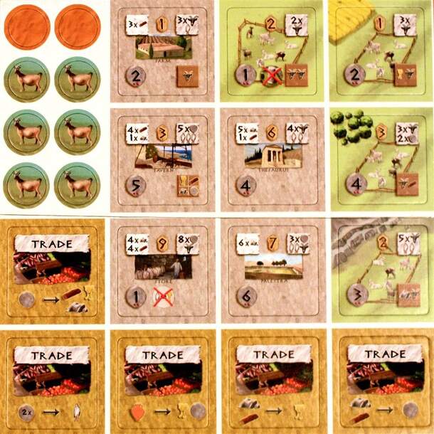 With the Peloponnes: Goat Expansion, players have a new resource in Peloponnes that can be exchanged for other resources or for money. Goats are acquired when acquiring a tile or during each round (depending on where the goal icon is located on the tile) and they're tracked on the Food chart, but usable only when the player acquires a tile with a goat on...