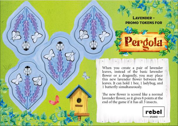 Hobby Next Lavender Promo tiles for Pergola When you create a pair of lavender leaves, instead of the basic lavender flower or a dragonfly, you may place this new lavender flower between the leaves. It can hold 1 bee, 1 ladybug, and 1 butterfly simultaneously. The new flower is scored like a normal lavender flower, so it gives 8 points at the end of the...