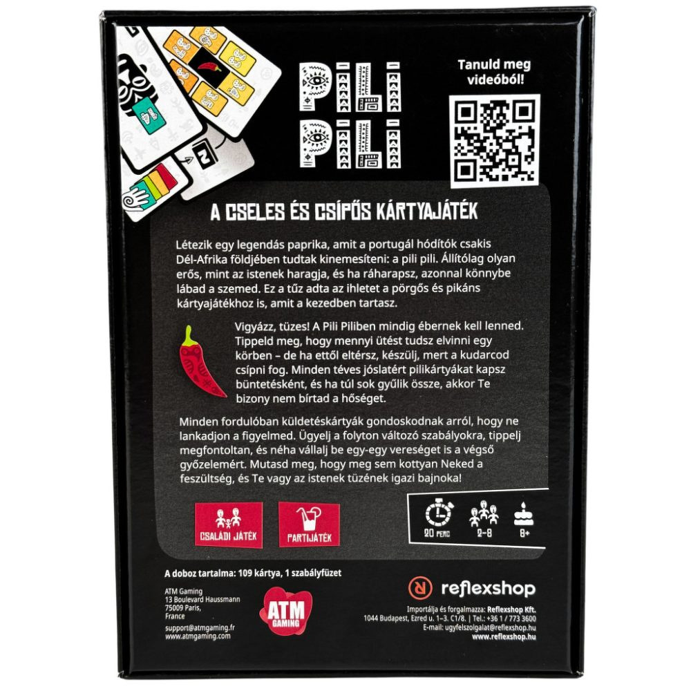A Pili Pili egy kiváló társasjáték, 2 - 8 játékos részére, az átlagos játékidő rövid, csak 20 - 30 perc. A társast, 8 éves kortól ajánljuk kipróbálni. A játékmenet erősen épít az ütés-váltós, a kockáztatás és a váltakozó képességek mechanizmusokra.