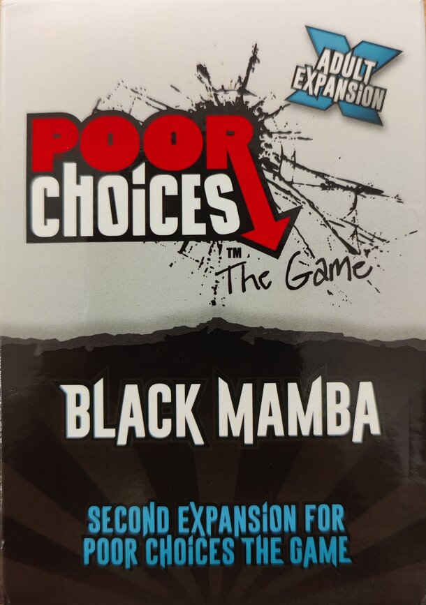 A Poor Choices: Black Mamba Expansion egy nagyon könnyen tanulható kiegészítő a Poor Choices társasjátékhoz, 3 - 10 játékos részére, az átlagos játékidő hosszabb, akár 30 - 120 perc is lehet. A társast felnőtteknek ajánljuk! A játékmenet erősen épít a kő-papír-olló, a kockáztatás, a szavazás, a történetmesélés és a színészkedés mechanizmusokra.
