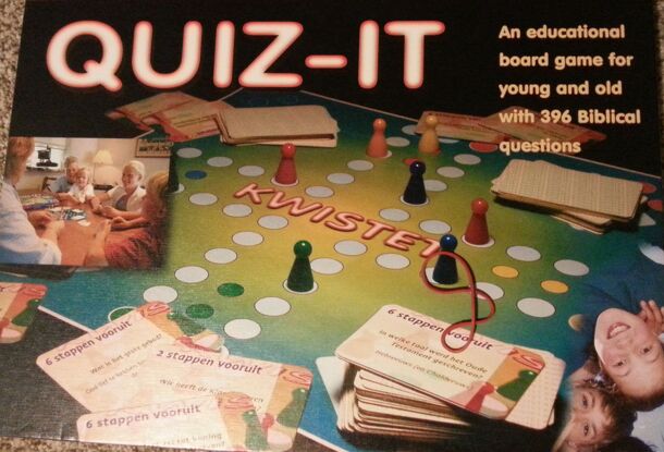A Bible trivia game translated from the Dutch game Kwistet. 396 questions about people, places, and events of the Bible.