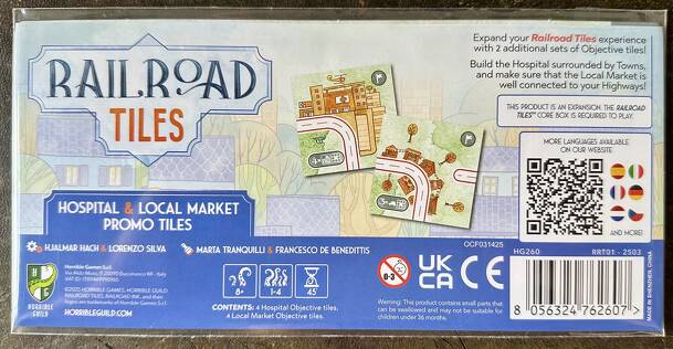 A Railroad Tiles: Hospital & Local Market Promo Tiles egy remek kiegészítő a Railroad Tiles társasjátékhoz, 1 - 4 játékos részére, az átlagos játékidő rövidebb, csak 45 perc. A társast, 8 éves kortól ajánljuk kipróbálni.