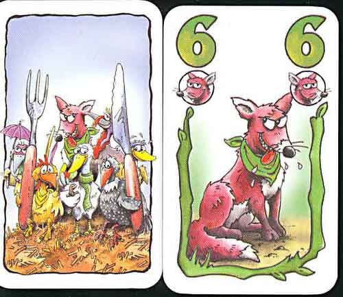 folyt: Ha egynél több róka szeretne lakmározni az adott mezőn lévő szárnyasokból, akkor harca kelnek egymással (sosem egyezkednek) ami a szárnyasok esetén már ismertetett módon zajlik. Az(ok) a játékos(ok) akik ‘menekülő madarat’ küldenek a mezőre (olyan szárnyast amelynek a pontértéke -2) egy zöld kukoricát kap(nak) mielőtt még megenné ő(ke)t a róka. A róka megkapja a szárnyas kártyát, így 2-vel csökken a pontszáma a játék végén Összefoglalva, a játékban a madarak kukoricát esznek, a rókák pedig madarakat, a győztes pedig az a játékos lesz akinek sikerül úgy felhasználnia a kártyáit, hogy a legtöbb kukoricát (pontot) gyűjti és legtöbb szárnyas kártyát eteti meg a rókáival.