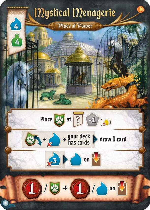 This new Place of Power was released as print and play file for Res Arcana in multiple languages. It was with minor chances later included in the "Res Arcana. Perlae Imperii Expansion" Mystical Menagerie Place of Power Cost: 4 blue and 4 green Essences Effect: Beast artifacts cost you one Essence (no Gold) less to play. Tap and Beast, pay one blue Essence:...