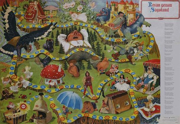 The board is in a fold-out-format and has 113 spaces, some with events connected to them. The events are written on the side of the board and are written in rhymes.