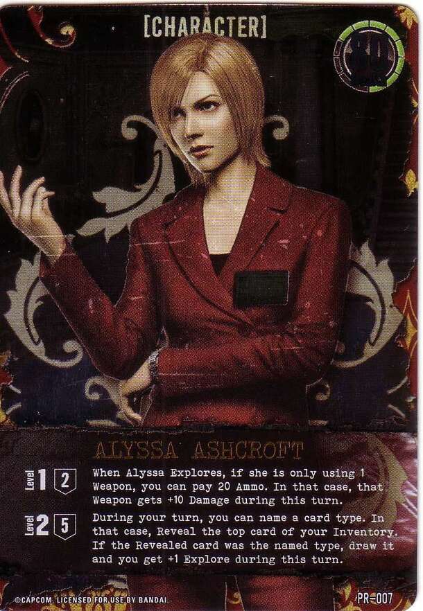 It was given at League Play Dec 2011 Alyssa Ashcroft Level 1 (2): When Alyssa explores, if she is only using 1 weapon, you can pay 20 ammo. In that case, that weapon gets +10 damage during this turn. Level 2 (5): During your turn, you can name a card type. In that case, reveal the top card of your inventory, if the revealed card was the named type, draw it...