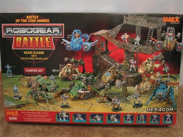 Robogear is a game system released by IMEX miniatures in the US, and Airfix in the UK. The game has 30mm-40mm miniatures that can be used with the free set of Robogear rules or for other miniature systems.