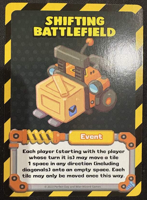 Promo released at Gen Con. It is a new card to shuffle into the Shop Deck. Name: Shifting Battlefield Type: Event Effect: Each player (starting with the player whose turn it is)...