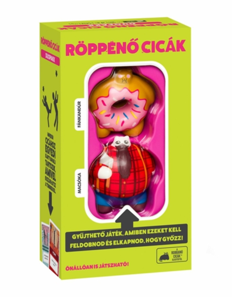Két új cica, rengetegúj mutatvány! A Röppenő cicák: Duopakk – Macsóka és Fánkandúr két újröppenő cicát és 24 friss mutatványkártyát hoz a játékba. Önálló partijátékként és az alapjáték kiegészítőjeként is új szintre emeli a macskadobó kihívásokat.